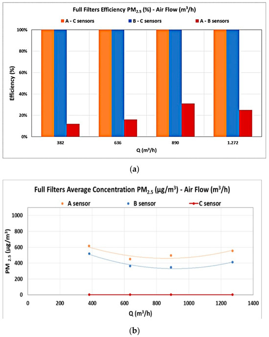In scenario (B), the performance of the filtering unit is demonstrated through the utilization of all available filters, the (G2) grease filter, a (G4) pre-filter, the (F8) and (H10) high-efficiency bag filters, and the FCC-AC, thereby exhibiting a 100% performance across all airflow variations between sensors (A–C). In accordance with the aforementioned data, the mean variation in PM2.5 is recorded as zero at output sensor element (C), thereby confirming the high efficiency of the filters employed in the stages of filtering (3–4) in the bag filter unit [8].