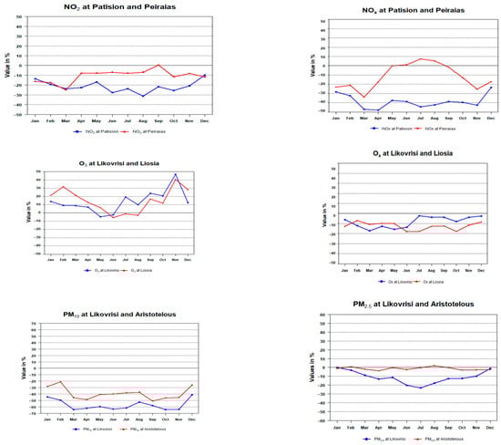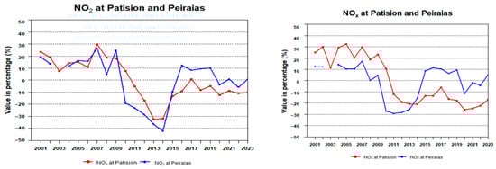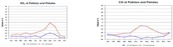 Looking into more detail by using percentage differences, as presented in Figure 3, the comparison between the 2001–2004 and 2020–2023 subperiods for SO2 in Patission shows a significant decrease in concentrations for all seasons (60–80%), while in Peireas the lower concentration decreases are observed during the August-October period probably influenced by the harbor activity. Almost the same pattern is observed for CO, although the maximum differences between the two stations are observed during the June–August period. The average decrease for NO2 in Patission is in the range of 20–30% and 5–15% in Peireas. The NOx decrease becomes 40–50% in Patission, while in Peireas a totally different pattern is observed with significantly smaller decreases (20–30%) during winter months followed by slight increases (up to 10%) during summer months. Ozone concentrations show an increase during recent years due to reduced NOx titration, but the Ox levels show general decreases for all months (5–20%) for both examined peripheral stations. Finally, PM10 concentrations at the peripheral station of Lykovrissi have decreased more significantly (60–70%) than in the central station of Patission (40–50%) for most months of the year. For PM2.5, the decreases are less significant in Lykovrissi and almost zero in the central station of Patission.