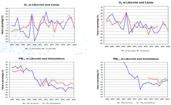 Percentage deviation from the mean annual concentrations of Ox and O3 (upper panels) and PM10-PM2.5 (lower panels) for the stations of Lykovrissi, Liossia, and Aristotelous. PM2.5 data start from 2007 in Lykovrissi and from 2016 in Aristotelous.