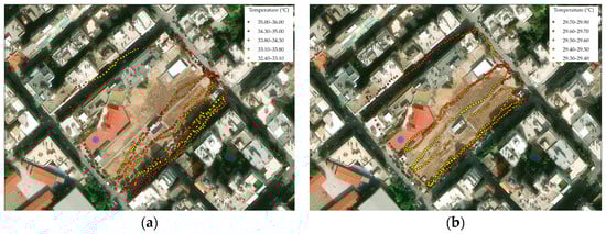 Following the completion of field measurements, data were processed and interpreted to identify areas experiencing elevated levels of human thermal stress. The analysis focused on microclimatic parameters directly related to thermal comfort and overall well-being, taking into account the specific environmental conditions of the site. During midday hours, air temperatures ranged from 34.7 °C to a peak of 36.5 °C, indicating intense thermal stress—particularly in areas lacking ventilation and shading. Wet-bulb temperatures, reflecting the body’s ability to dissipate heat through evaporation, also showed elevated values, suggesting a heightened risk of discomfort. Globe temperature readings, which account for solar radiation, further intensified the perceived heat load. High relative humidity levels reduced evaporative cooling efficiency, compounding the discomfort. Although primarily relevant in colder conditions, the wind chill index was included as a comparative parameter for nighttime analysis. Characteristic values for each parameter across different time periods are presented in Table 1 and Table 2.