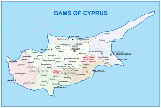 Cyprus is situated in the Eastern Mediterranean, with annual precipitation occur-ring predominantly between October–April and totals ranging from about 300 mm in the plains to over 1000 mm in the Troodos Mountains [1]. Over recent decades, the island has seen a statistically significant warming trend of around 0.4–0.6 °C per decade, along with a projected 10% reduction in annual precipitation by 2040. This climatic shift has led to recurrent droughts by the early 2020s. Water reservoirs (dams) are operating at roughly 24–27% of capacity during dry years and water scarcity has become a chronic challenge for domestic use, agriculture and tourism (Figure 1).