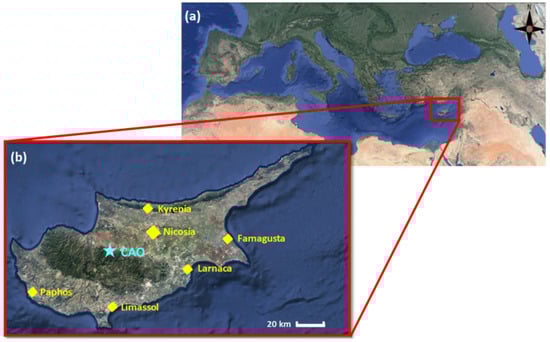 Regional setting of Cyprus (a) and inset map of Cyprus with the major districts labelled in yellow (b) CAO refers to the Cyprus Institute Atmospheric Observatory—Agia Marina station, which would be an ideal location for installing the proposed C-band radar.
