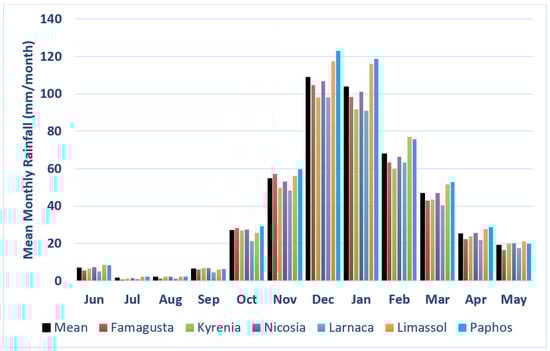 Figure 3 shows the long-term (1991–2024) mean monthly rainfall recorded over the six main districts of Cyprus. The data shows a normalized distribution with mean monthly rainfall exceeding 20 mm during the 7-month period of October–April, with peaks exceeding 100 mm during December through January. Further analysis of daily rainfall indicates up to 16 events per month during October–April. Alternatively, up to 6 events per month are observed during the May–September period, localized over the central highlands, which may offer potentially suitable sites for deploying ground-based flare trees to augment aircraft seeding operations when cloud bases are sufficiently low (not safely reachable by seeding aircraft). Importantly, more than 90% [11] of the wintertime rainfall events are situated in the central region—well beyond the northern occupied territories of the country, which are excluded from any planned cloud seeding operations.
