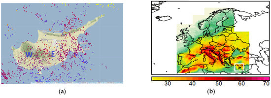 In addition to the rain gauge data, lightning data were examined to further characterize convective activity. Figure 4 presents a sample of lightning occurrences over Cyprus on 17 October 2022 (a) and the annual average thunderstorm days over Europe and the Mediterranean during 2008–2017 (b) [12].