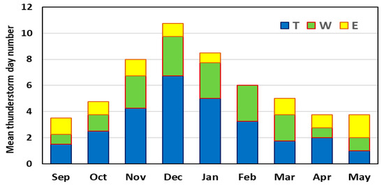 Average monthly thunderstorm day number based on thunderstorm–lightning data (September 2021–May 2025) for western (W), eastern (E) and total (T) western–eastern Cyprus region.