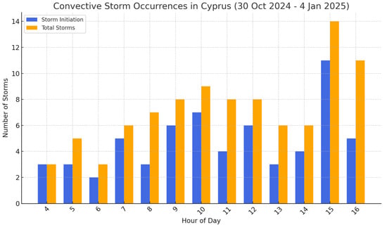 Figure 6 shows the hourly histogram of TITAN-identified convective storm occurrences (cells > 30 dBZ at 2 km MSL with volume > 15 km3) across Cyprus during 30 October 2024 to 4 January 2025. In total, 62 storms were initiated, and 94 storms occurred over the ~2-month study period. This analysis was limited to the daily period of 04:00 and 17:00 UTC to focus on daylight seeding opportunities. Hence, a portion of storms recorded as initiating at 0400 UTC may be holdovers from existing nocturnal convection. The histogram shows a nearly bimodal daytime diurnal cycle of storm initiation with peaks around noon (7) and late afternoon (11). Storm initiation is low in the early hours, gradually increasing throughout the day, while total storm occurrences show a sharp rise after midday. However, the analysis is limited by the short data period (~2 months), which does not capture seasonal variability or extreme events.