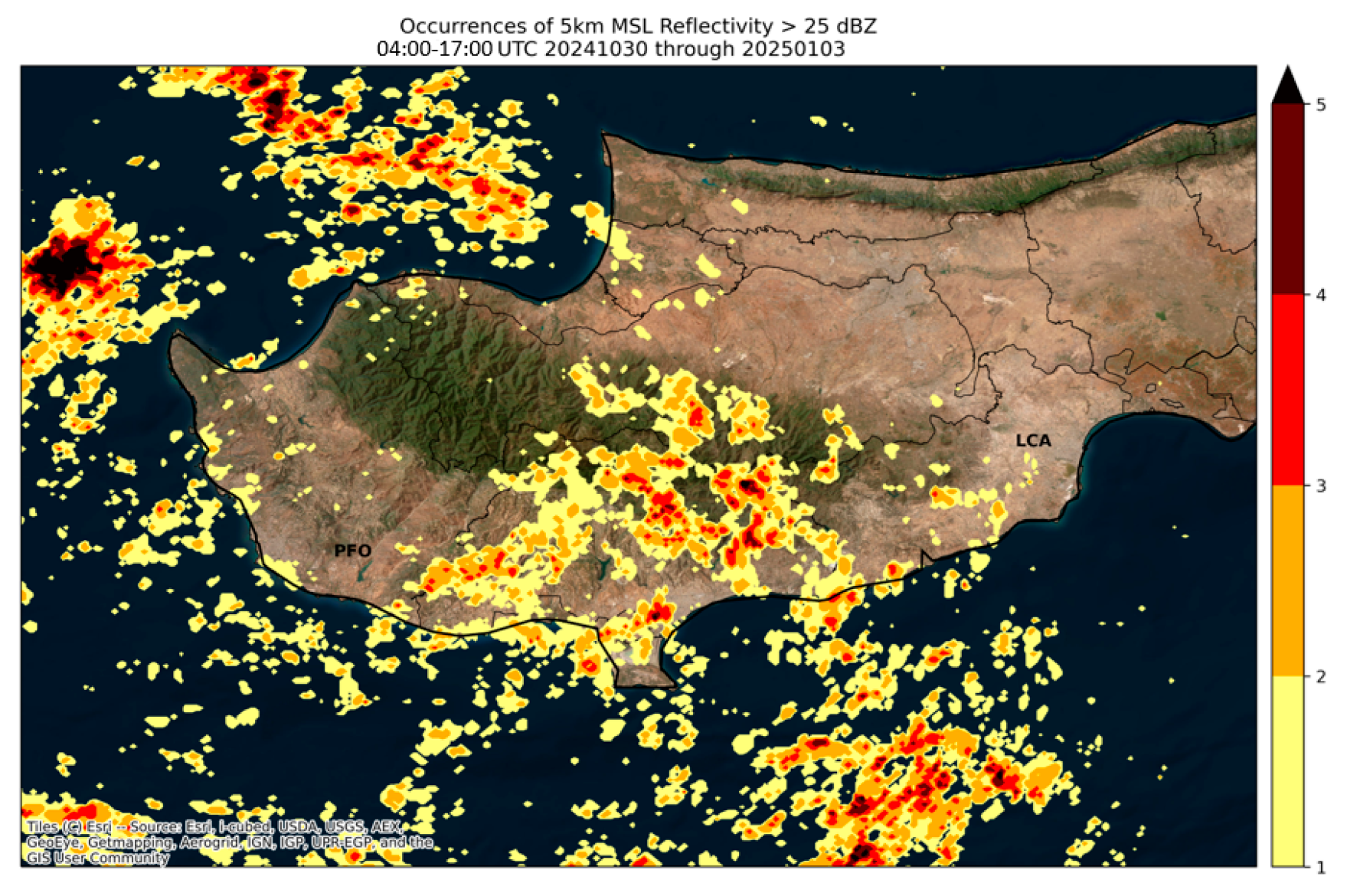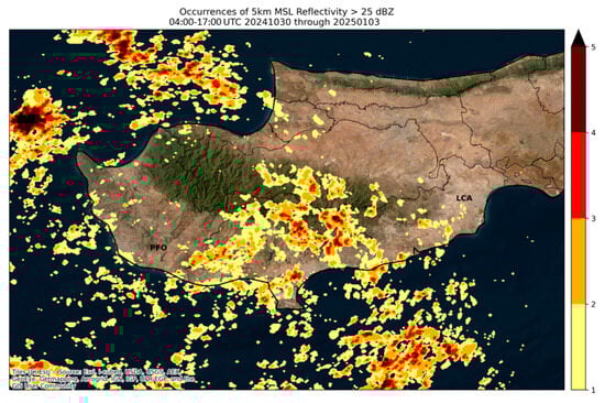 Figure 7 shows the spatial distribution of radar echoes meeting the glaciogenic seeding criterion, defined as reflectivity ≥ 25 dBZ at 5 km MSL This altitude matches the climatological −10 °C level over Cyprus for the October to January based on ERA5 reanalysis, representing the mixed-phase region where supercooled liquid water is typically present.