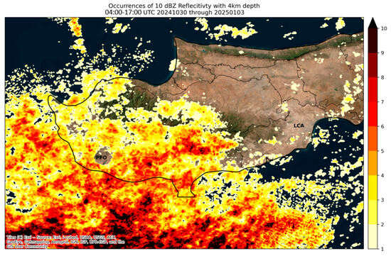 Spatial distribution of radar echoes ≥ 10 dBZ with at least 4 km of vertical extent (hygroscopic seeding potential) observed over Cyprus from 30 October 2024 to 3 January 2025.