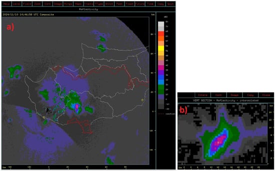 Figure 9a depicts an example of an intense convective cell observed south–central Cyprus during the study period, with composite reflectivity exceeding 45–50 dBZ in the core. The vertical cross-section (Figure 9b) reveals echo tops surpassing 10 km MSL and strong reflectivity (>30 dBZ) extending well through the mixed-phase region, indicating abundant supercooled liquid water aloft.