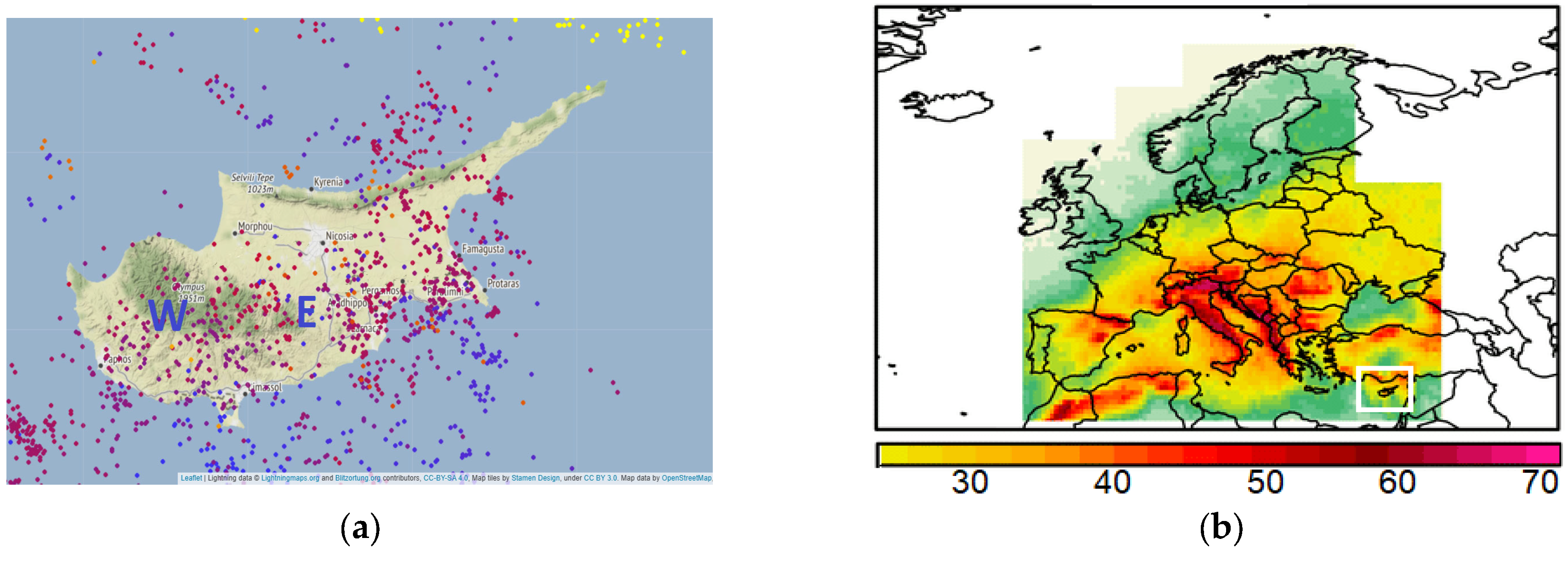 Figure 4 presents a sample of lightning occurrences over Cyprus on 17 October 2022 (a) and the annual average thunderstorm days over Europe and the Mediterranean during 2008–2017 (b) [