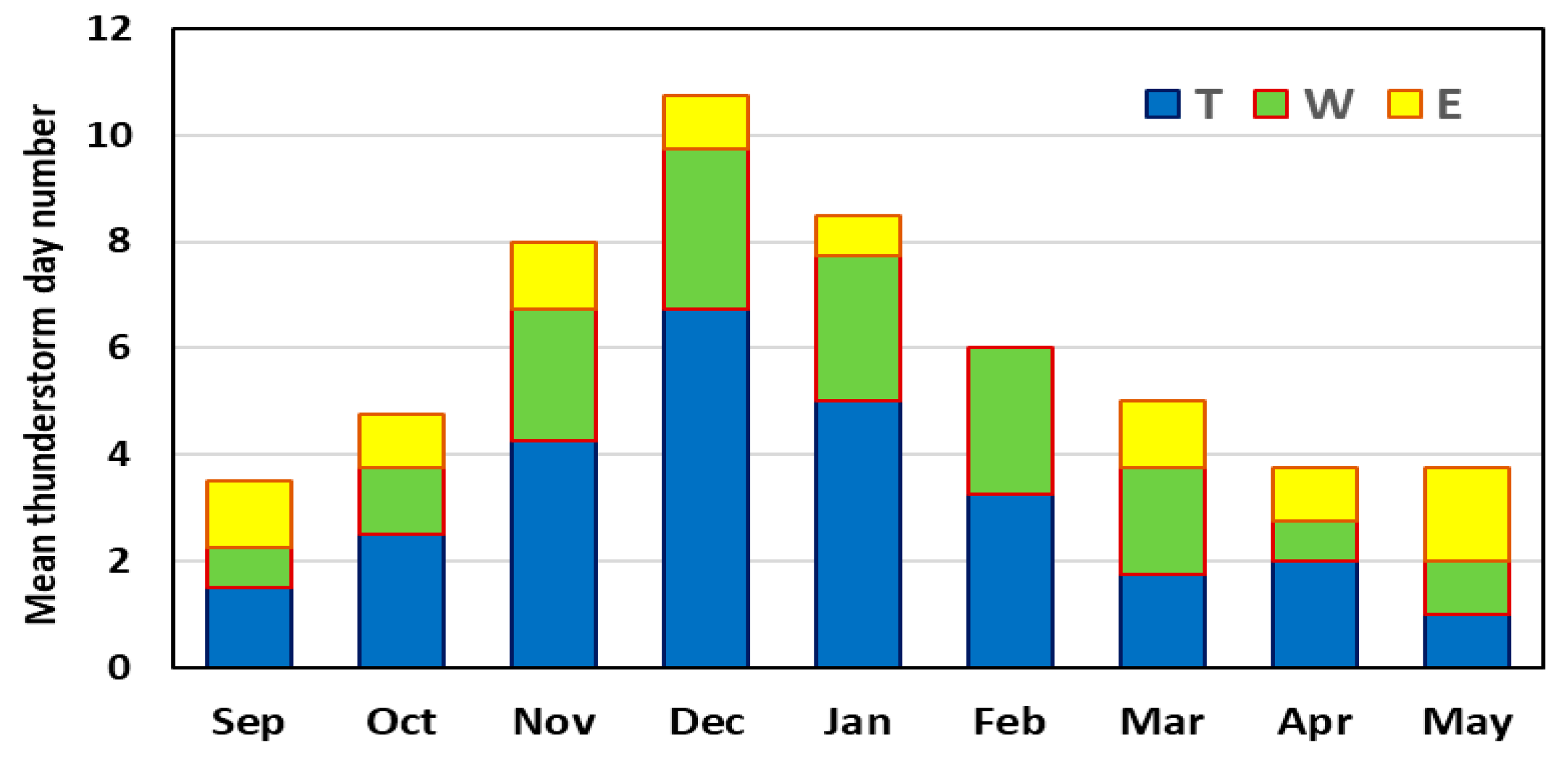 December represents the peak regional thunderstorm frequency (~10.5 days) and the largest extent of activity, with a notable extent in the western region (W) and some in the eastern region (E).