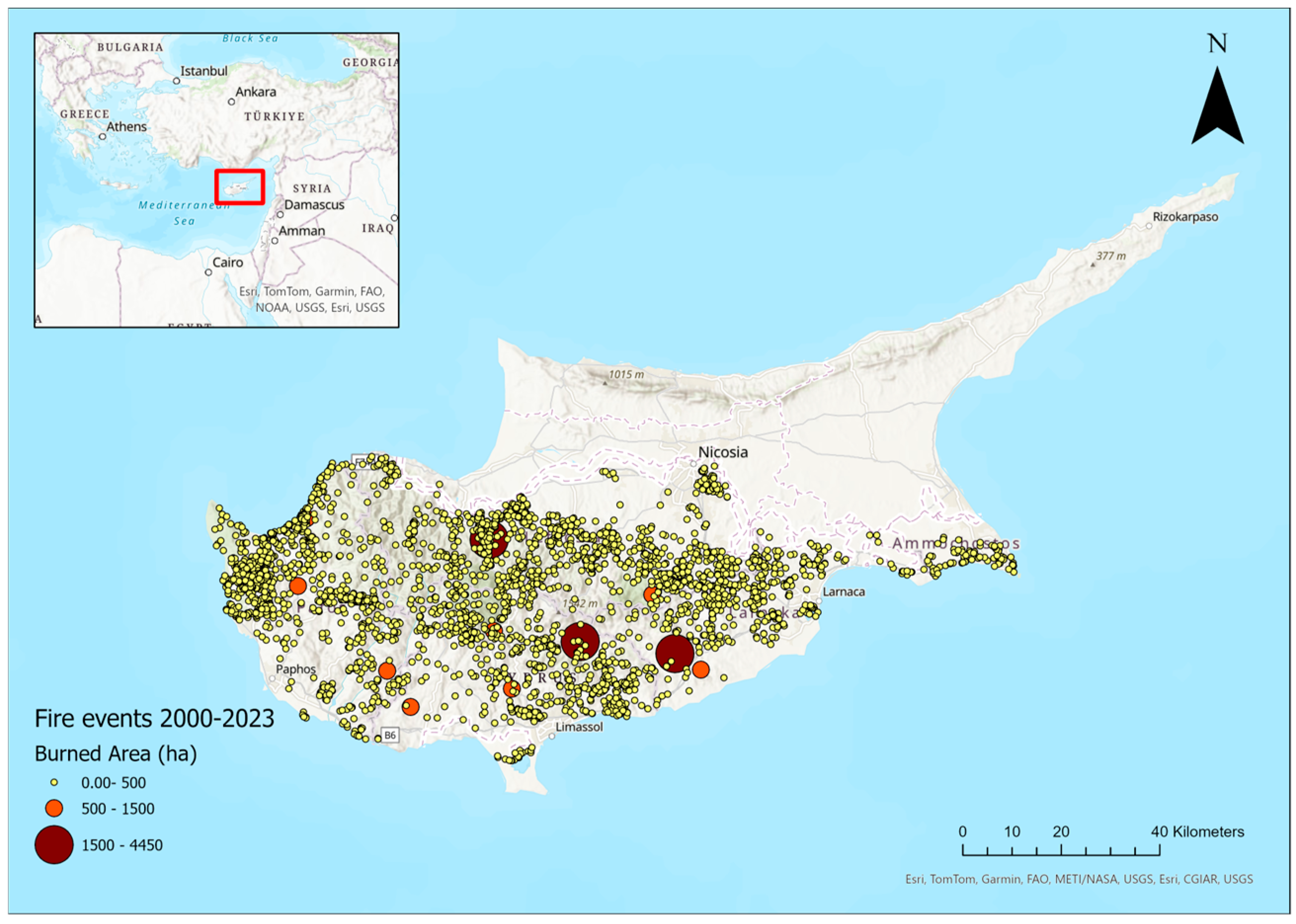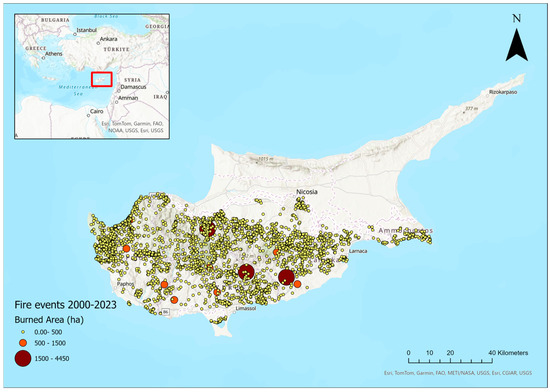 - Department of Forests in Cyprus. Forest Fire Statistics for the Period 2000-2023; Department of Forests in Cyprus: Lefkosia, Cyprus, 2023. [Google Scholar]