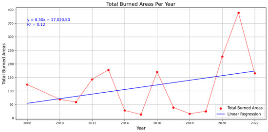 Based on the analysis of the annual variation in fire frequency in the Cyprus region during the summer months from 2008 to 2024, the results present a moderate increasing trend, as shown in Figure 2, with an average annual increase of 8.5 hectares. However, the low R2 (0.12) indicates high interannual variability, suggesting that fire activity is driven by complex, non-linear environmental and anthropogenic factors.