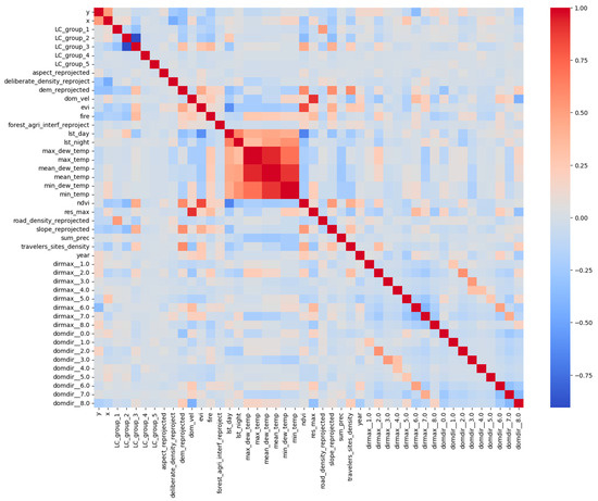 Based on the Pearson correlation (Figure 3), a strong positive relationship was indicated between temperature-related variables (e.g., max, mean, and dew point temperatures), indicating their independence. In addition to that, vegetation indices (EVI and NDVI) also showed strong correlation, reflecting consistent vegetation dynamics. Fire occurrence shows weak to moderate positive correlations with variables such as maximum temperature and NDVI and negative correlations with precipitation and nighttime land surface temperature. These results underscore the importance of investigating various fire-related variables to comprehend fire dynamics.