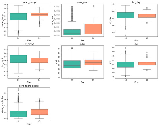 Boxplots comparing the distribution of key environmental variables between fire-affected (fire = 1) and non-fire (fire = 0) locations.