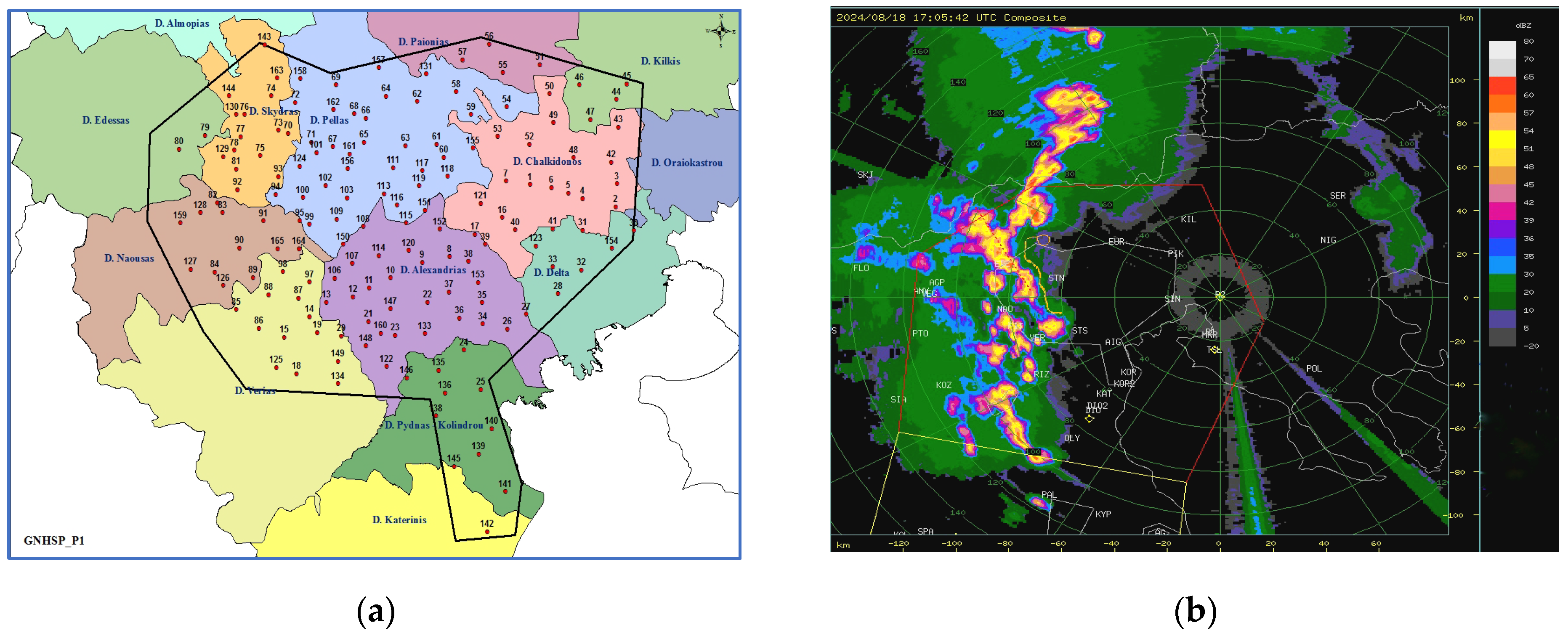 Figure 1a shows the plain of Central Macedonia, which is one of the two GNHSP protection areas. Over the same region, a network of 157 hailpad stations is in operation, and each hailpad carries an ID number and a position defined by the coordinate longitude and latitude of its location, while it corresponds to a mean area of 17.5 km