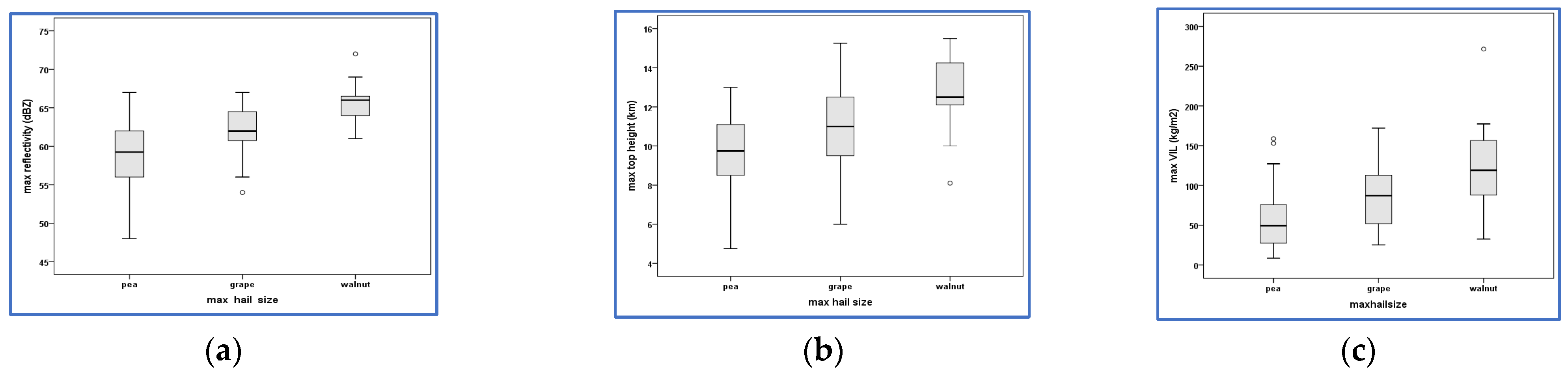 Figure 2). Although there is considerable overlap between the distributions, an increase in their median is observed among all types of hailstorms. The range of values for walnut hailstorms is considerably narrower in comparison with the rest, with a median for maxRef of 67 dBZ versus 62 and 59 dBZ for grape hailstorms and pea hailstorms, a median for maxTop of 12.5, versus 11 and 9.5 km, respectively, and maxVIL values over 90 kg/m