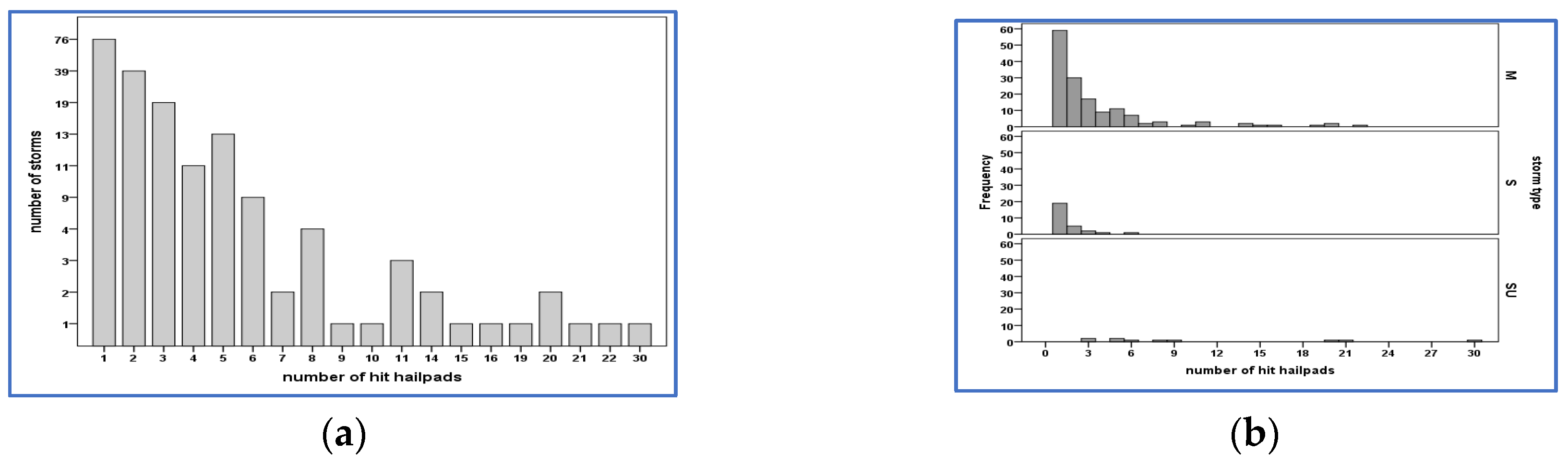 A next step is to analyze the hailpad data in relation to the frequency with which they are hit per storm type and the distribution of the corresponding hailfall characteristics in space. Analysis of the number of hit hailpads per hailstorm showed that for 40% of the total number of 188 hailstorms, one (1) hit hailpad was recorded (