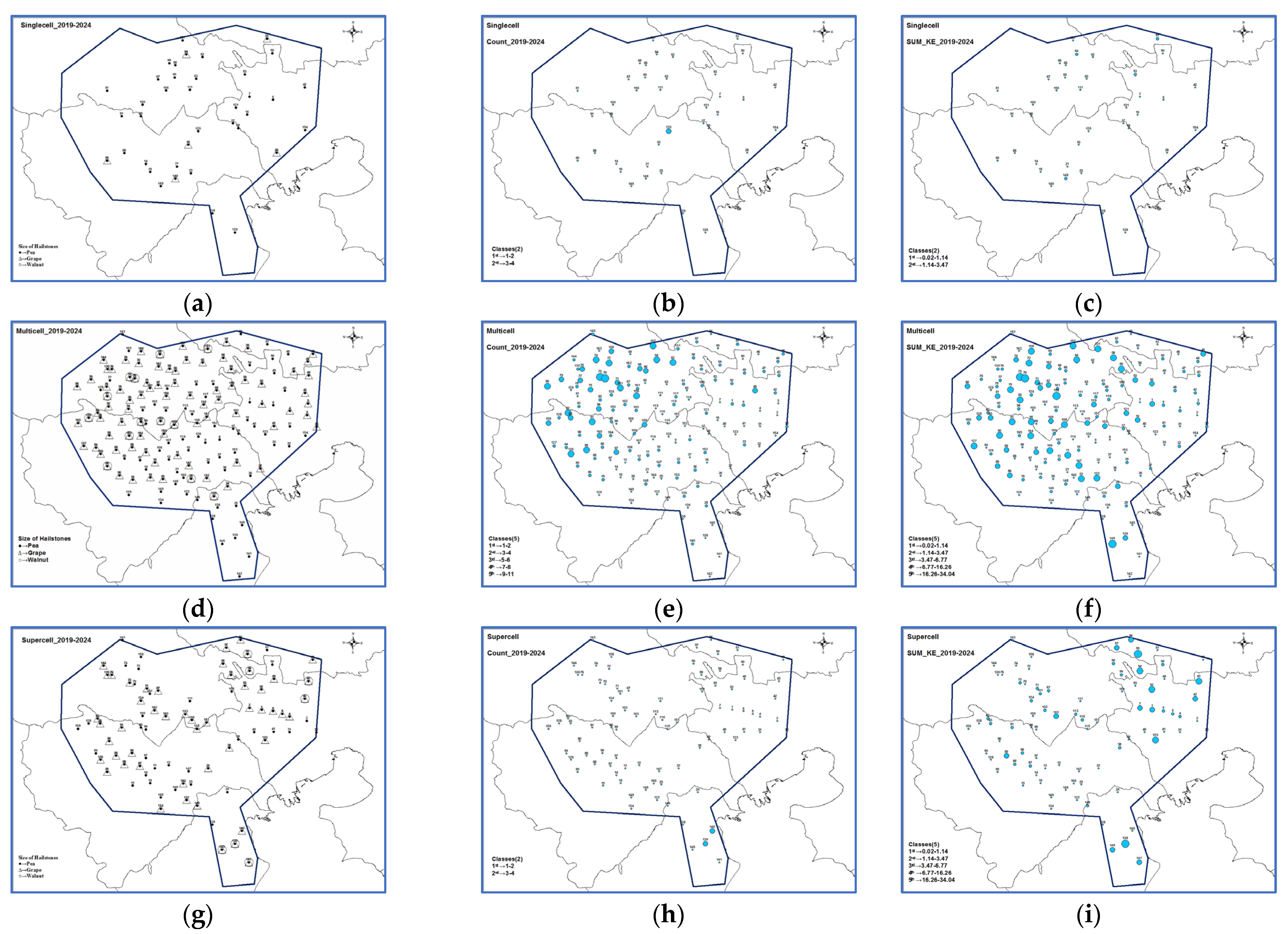 Figure 4a,d,g, pea size recorded hail on a hailpad is depicted with a dot, grape size with a triangle and walnut size with a circle. The three marks are overlaid on hailpads that were hit more than once and recorded multiple hail sizes. All three sizes are found only for multicell and supercell storms, while for single-cell storms only the two smaller sizes exist. The frequency with which every hailpad was hit, ranging from one to eleven times, has been classified into five classes. All five classes are found only for multicells, while the other two storm categories contain only the first two classes. Finally, the cumulative kinetic energy of every hailpad for each of the three storm types, ranging from 0.02 to 34.04 Joules, has been classified also into five classes. All five classes are found for multicells and supercells, while for single-cell storms only the two lower classes appear in the dataset. The representation of the classes in