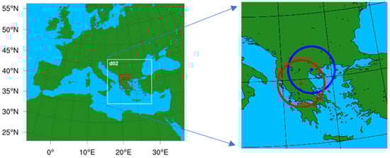 Model domain setup and detailed view of domain d02 depicting the locations of the radars (200 km range), using red for the Liopraso radar (39.67° N, 21.85° E) and blue for the Filyro radar (40.67° N, 23.01° E).