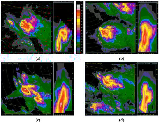 Radar reflectivity images (composite) and vertical cross sections at different times on September 7, 2024: (a) SC2—15:32 UTC; (b) SC2—17:56 UTC; (c) SC3—15:50 UTC; and (d) SC3—17:08 UTC.