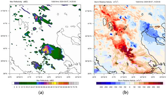 Regarding maximum reflectivity, ETA_00 resulted in the smallest values in both the intensity and area covered. In the ETA_12 run, the storms lasted longer and were more intense. WSM6_00 and WSM6_12 (Figure 3a) runs had the distinct feature that the predicted reflectivity appeared to be attributed to storms that happened in two parallel zones. Storm relative helicity (SRH), a parameter whose high values are closely related to intense thunderstorms (supercells), showed values greater than 350 m2 s−2 in the WSM6_12 run (Figure 3b). In the WSM6_00 run, the predicted SRH values were lower (but still close to 350 m2 s−2) and had a rapid decay after their peak. ETA_12 and ETA_00 had a similar behavior with a swift decline of the SRH values after reaching peak values of more than 300 m2 s−2.