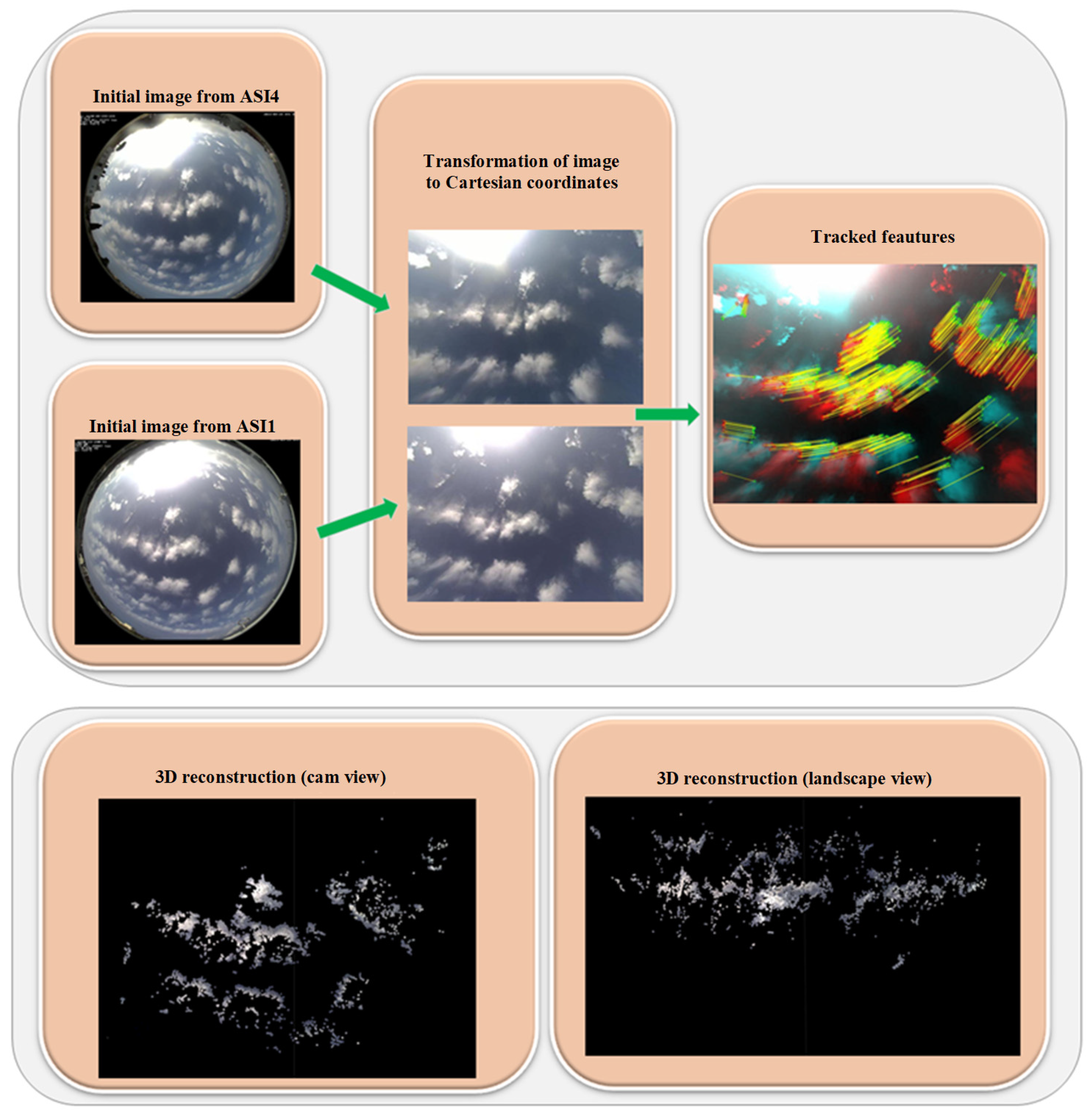 4]. In this study, we demonstrate the methodology of reproducing the 3D structure of clouds using advance image processing techniques for sky images captured by one or more ASIs. This information can serve as a valuable input for improving the estimation and nowcasting of solar irradiance resources as well as the role of clouds on climate in future applications.