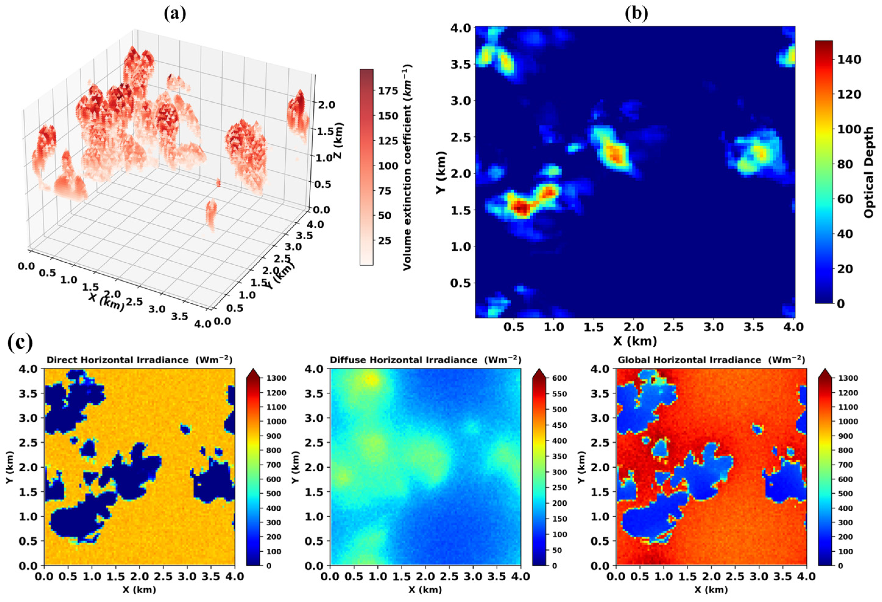 Figure 2a illustrates an example of an artificial 3D cumulus cloud field used in the MYSTIC radiative transfer model to simulate solar radiation reaching the Earth’s surface. Cumulus clouds, which are commonly observed in the broader region of Rio, Patras, were selected for this scenario due to their relevance and frequency.