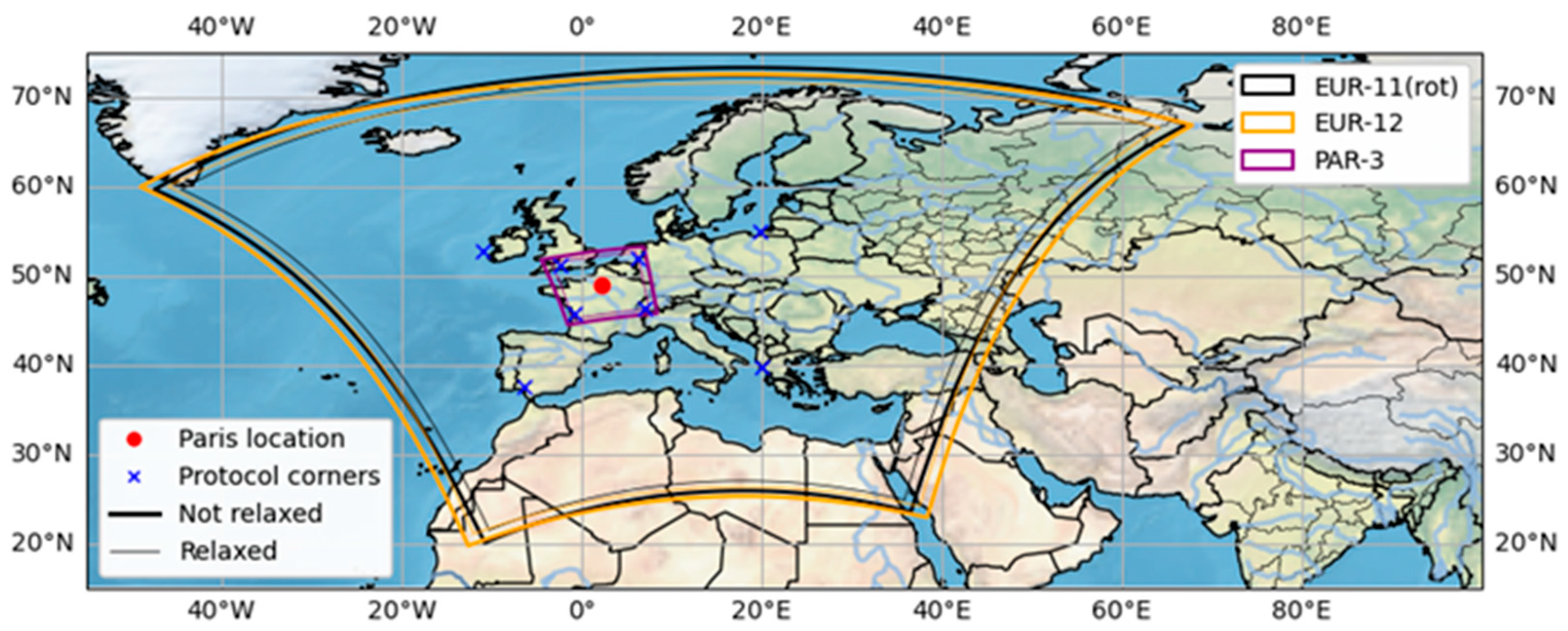 - Katragkou, E.; Sobolowski, S.P.; Teichmann, C.; Solmon, F.; Pavlidis, V.; Rechid, D.; Hoffmann, P.; Fernandez, J.; Nikulin, G.; Jacob, D. Delivering an Improved Framework for the New Generation of CMIP6-Driven EURO-CORDEX Regional Climate Simulations. Bull. Am. Meteorol. Soc. 2024, 105, E962–E974. [Google Scholar] [CrossRef]