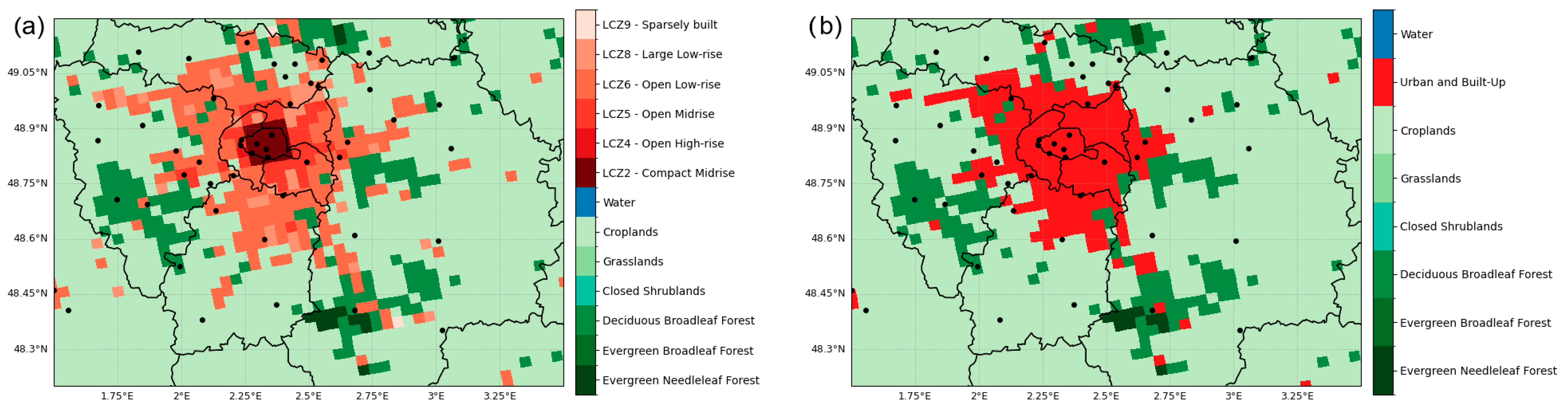Figure 2a). The LCZ system includes 17 land-use types, with 10 focused on urban areas. The BEP-BEM scheme uses the 10 urban classes plus the “Bare rock or paved” (considered as asphalt, class E), offering more detail and discretization for urban cells than category 13 (“Urban and Built-Up”) of IGBP MODIS.