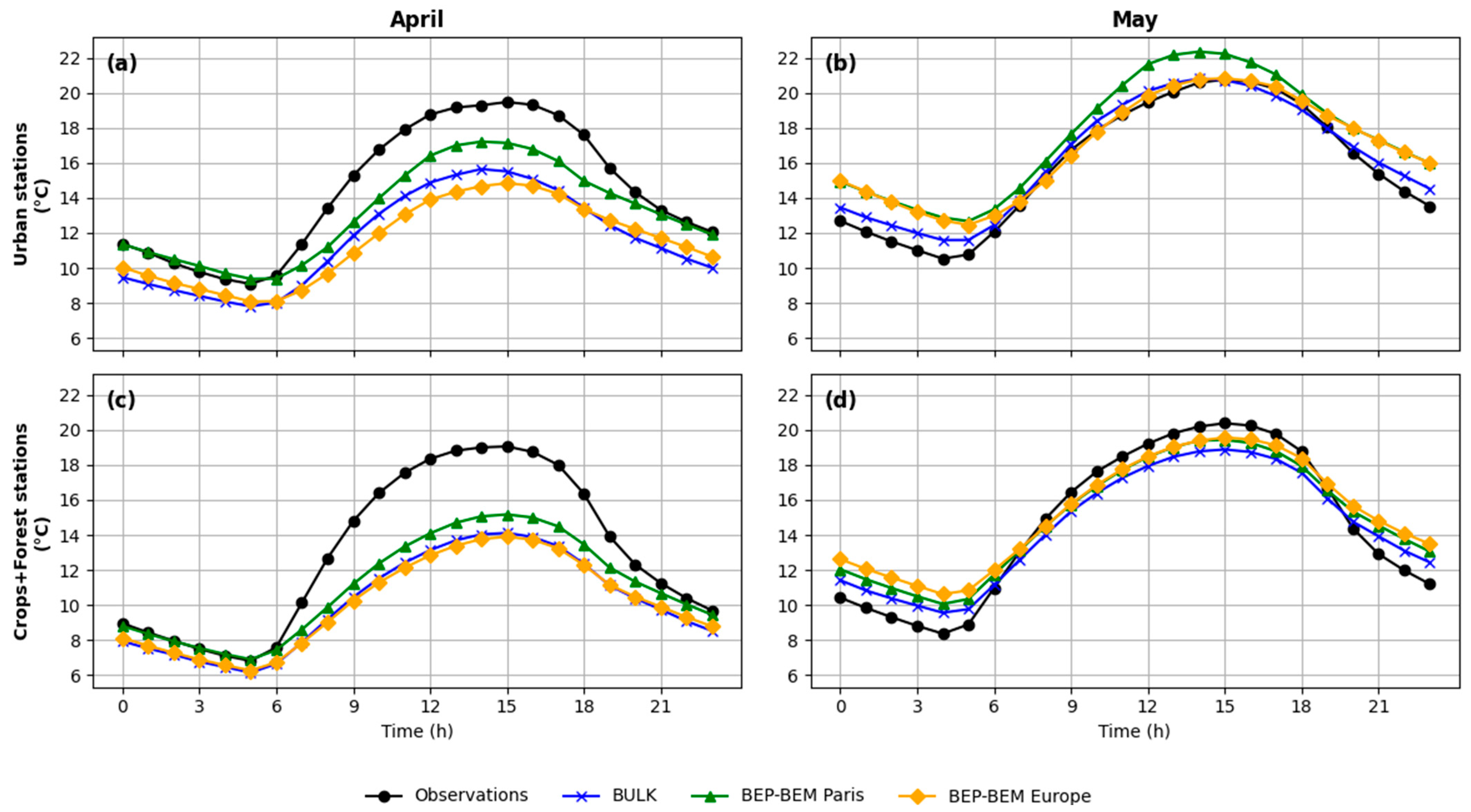 Figure 3b,d), all three simulations tend to overestimate nighttime temperatures for urban and crops/forest stations, while BEP-BEM Europe appears to be more precise on sunlight hours. BEP-BEM Paris slightly overestimates temperature throughout the whole day, especially for urban stations for this month. Despite being the simplest and least computationally demanding configuration, the BULK run shows good performance for May, reaching the precision of BEP-BEM runs.