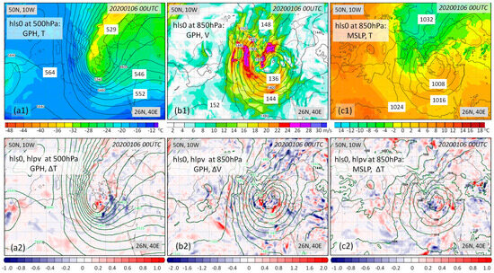 Upper panel: (a1) 500 hPa geopotential height contours at 3 dam intervals and temperature in °C; (b1) 850 hPa geopotential height contours at 2 dam intervals and wind in m/s; (c1) MSLP contours at 4 hPa intervals and 850 temperature in °C; these graphs refer to runs with Aeolus data (hls0) assimilated data. Lower panel: (a2) 500 hPa geopotential height contours at 3 dam intervals and temperature differences in °C; (b2) 850 hPa geopotential height contours at 2 dam intervals and wind differences in m/s; (c2) MSLP contours at 4 hPa intervals and 850 temperature differences in °C; the black and green contours refer to runs assimilated with and without Aeolus data assimilation, hls0 and hlpv, respectively, with the differences referring to hls0−hlpv. All the graphs refer to 00+ 24 h forecast time of the model runs, corresponding to 6 January 2020: 00 UTC.