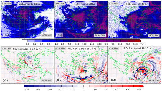 The upper row graphs refer to the 12 h accumulated precipitation in mm, from the (a1) 6th to the 18th hour of the model run; (b1) 18th to the 30th hour of the model run; (c1) 30th to the 42nd hour of the model run. The graphs refer to runs assimilated with Aeolus data (hls0). The lower row graphs (a2–c2) refer to the corresponding differences (Δpreci) between the runs assimilated with and without Aeolus data (hls0−hlpv), respectively.