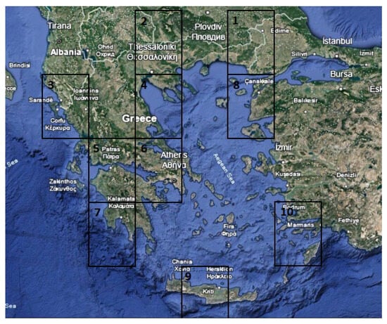 The methodology employed in this study applies time series analysis [] of temperature data at the 500 hPa [] atmospheric layer, 850 hPa [] atmospheric layer, and surface total precipitation []. The selection of the 500 hPa and 850 hPa atmospheric layers is driven by their relative disconnection to surface-level influences, such as the Foehn effect [], temperature inversions [], and the urban heat island effect [,], which can distort surface climate data. For the scope of this study, ten large administrative regions of Greece (Thrace, Central Macedonia, Epirus, Thessaly, Ionian Islands/Western Greece, Central Greece/Attica/Euboea, Peloponnese, North Aegean, Crete, and South Aegean) were selected (Figure 1).