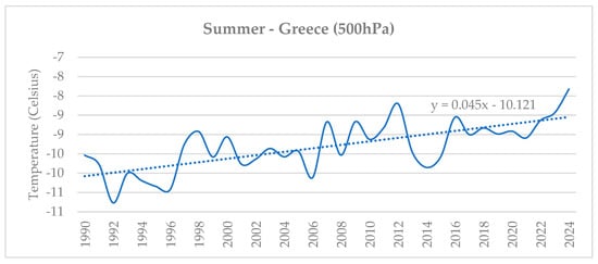 The results of data analysis for 500 hPa (Figure 2) show a clear trend of increase with a rate of 0.045 degrees Celsius per year and a total increase of +1.5 degrees Celsius from 1990 to 2024. The diagram shows incidents of lower temperatures in a periodicity of ~9 years (1996, 2006, 2014, 2021) and incidents of higher temperatures in a periodicity of ~10 years (1998, 2012, 2024). Highest temperature in 2024 and lower temperature in 1992.