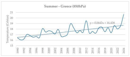 The results of data analysis for 850 hPa (Figure 3) show a clear trend of increase with a rate of 0.0642 degrees Celsius per year and a total increase of +2.2 degrees Celsius from 1990 to 2024. The diagram shows incidents of lower temperatures in a periodicity of ~9 years (1996, 2004, 2013, and 2020) and incidents of higher temperatures in a periodicity of ~10 years (1998, 2007, 2012, and 2024). Highest temperature in 2024 and lowest temperature in 1991.