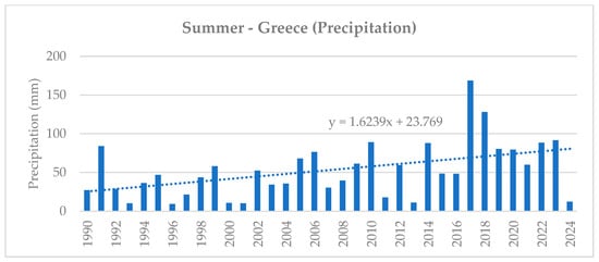 The results of data analysis for total precipitation (Figure 4) show a clear trend of increase with a rate of 1.6239 mm per year and a total increase of +57 mm from 1990 to 2024. The diagram discloses a serious increase in summer precipitation after 2017. From 1990 to 2016, the average precipitation was ~40 mm per year, while from 2017 to 2024, the average precipitation reached an amount of ~88 mm per year.