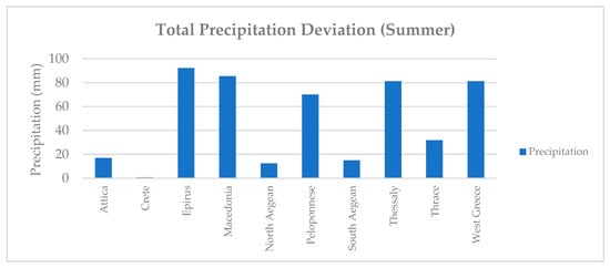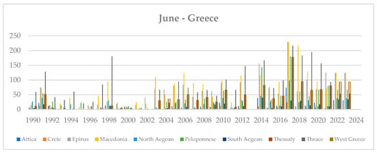 The analysis reveals a consistent upward trend in both mid- and lower-tropospheric temperatures of 500 hPa and 850 hPa layers, as well as in total precipitation []. Although these changes are not uniformly distributed across all regions, the overall pattern of increase is evident []. It is particularly noteworthy that the variation in total precipitation among the regions of Attica, North Aegean, South Aegean, and Crete is relatively small, indicating a similar response in precipitation trends across the east and south areas of Greece. Additionally, the overall increase in summer precipitation is substantiated mainly by the notable enhancement in precipitation during June (Figure 7).