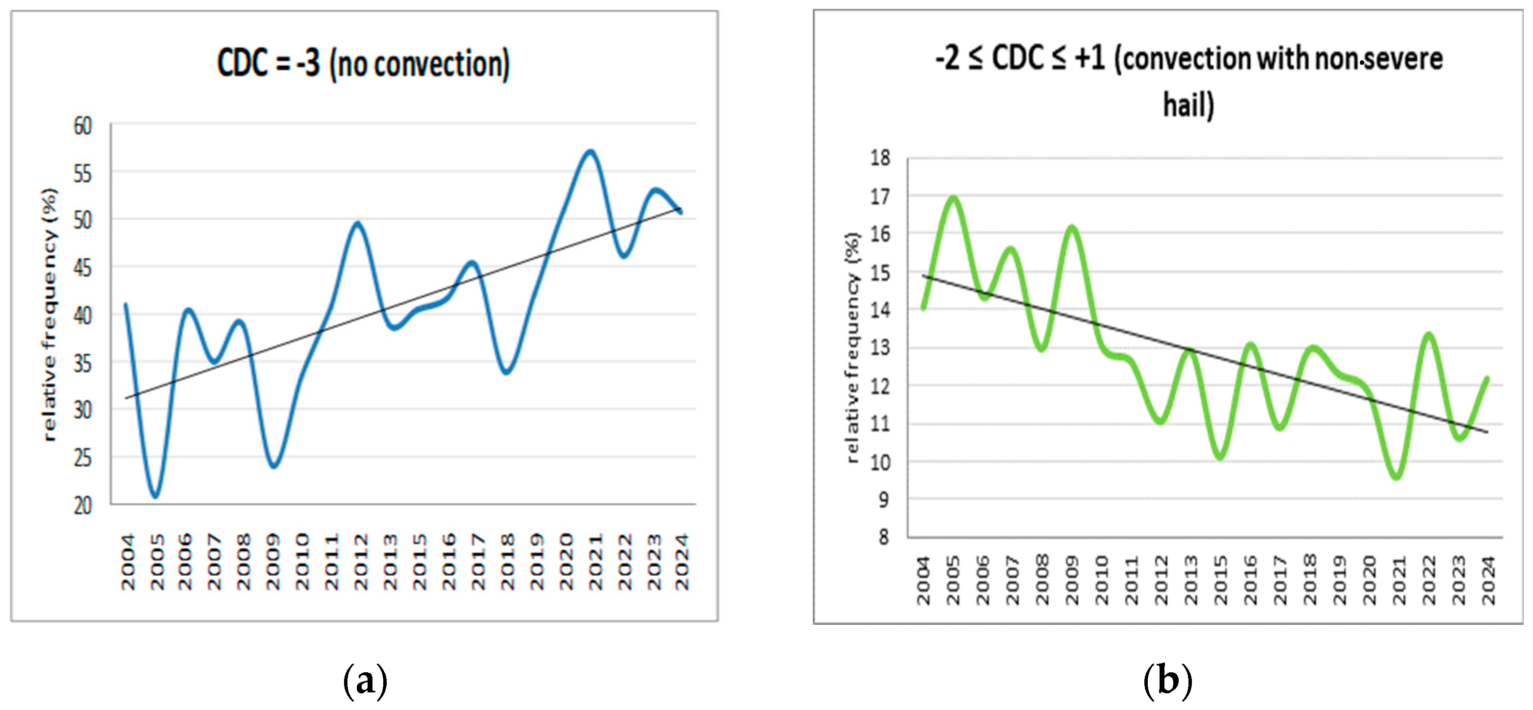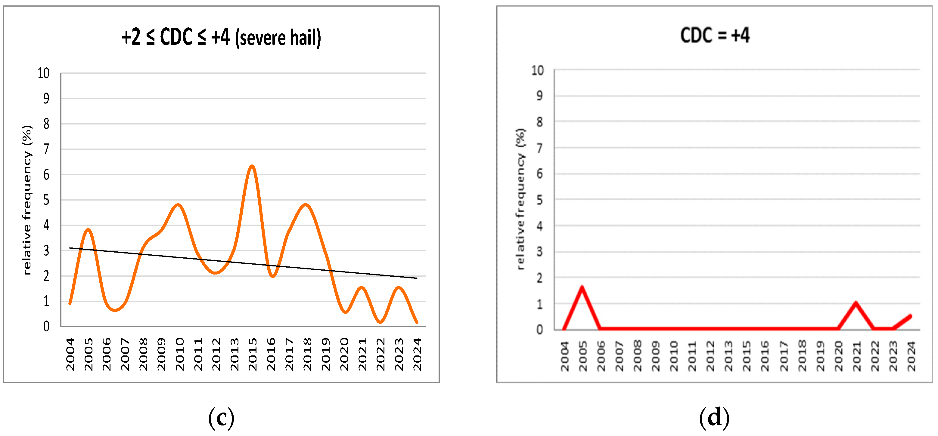 A 21-year-long dataset of the daily values of the observed CDC was constructed during the GNHSP. The relative frequency of days with no deep convection (observed CDC = −3) increased from ~30% before 2010 to ~50% after 2020 (Figure 1a), indicating that convection is going to be less frequent in a changing climate, most likely due to the decreasing cases of CAA (Cold Air Advection). Also, the frequency of cases with weak to moderate convection (−2 ≤ CDC ≤ +1) has also decreased by ~5% (Figure 1b). However, almost no reduction (1%) is observed as far as the frequency of severe cases is concerned (+2 ≤ CDC, Figure 1c), especially of those with CDC = +4 (Figure 1d), which actually tended to increase in the last few years. The developing “gap” between no deep convection and severe convection indicates a future climatic scenario of less convection but with potentially more severe cases, presumably due to the increased moisture content of the atmosphere, as temperature increases. Focusing on the most severe cases, the maximum CDC value (+4) corresponds to severe thunderstorms of golf ball hail size (3.3–5.2 cm in diameter). CDC = +4 was observed in six (6) out of the total of 3763 operational days, three times in 2005, twice in 2021 and once in 2024 (Figure 1d). The topic of this paper is the latter case, 7 September 2024, when an extremely severe supercell produced egg-size hail in Thessaly, Greece.