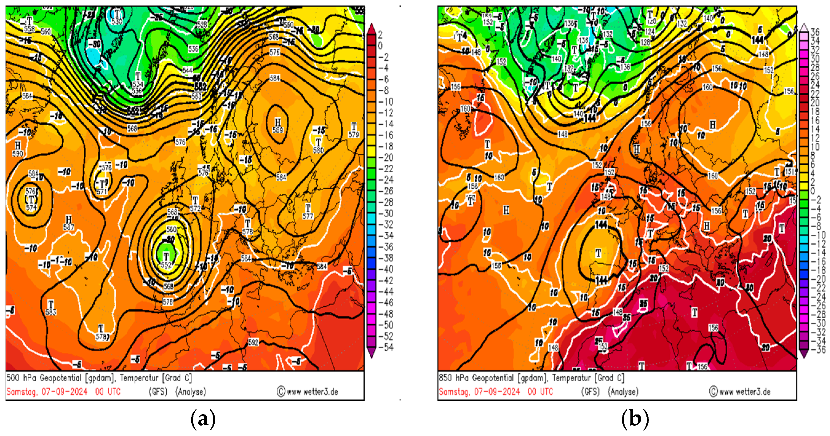 Figure 2. Geopotential height (gpdam) and temperature (colour shading °C) analysis charts on 7 September 2024 at 00:00 UTC: (a) 500 hPa; (b) 850 hPa. Reprinted with permission from ref. [12]. Copyright 2025 Wetter3.de (Rainer Behrendt, Holger Mahlke).