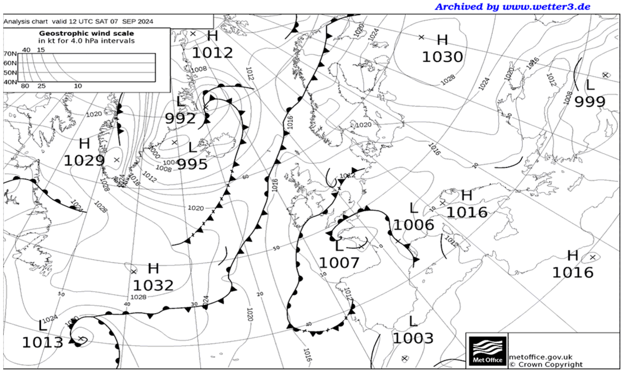 Figure 3. Analysis surface weather chart at 12:00 UTC. Reprinted with permission from ref. [13]. Copyright 2025 British Crown copyright, Met Office.