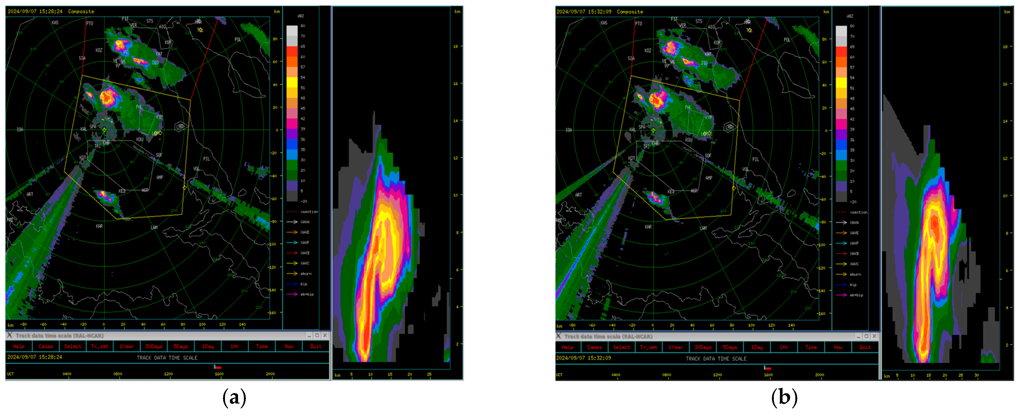 Figure 4. Composite radar reflectivity images and vertical cross-sections at specified times on 7 September 2024: (a) 15:28 UTC; (b) 15:32 UTC.