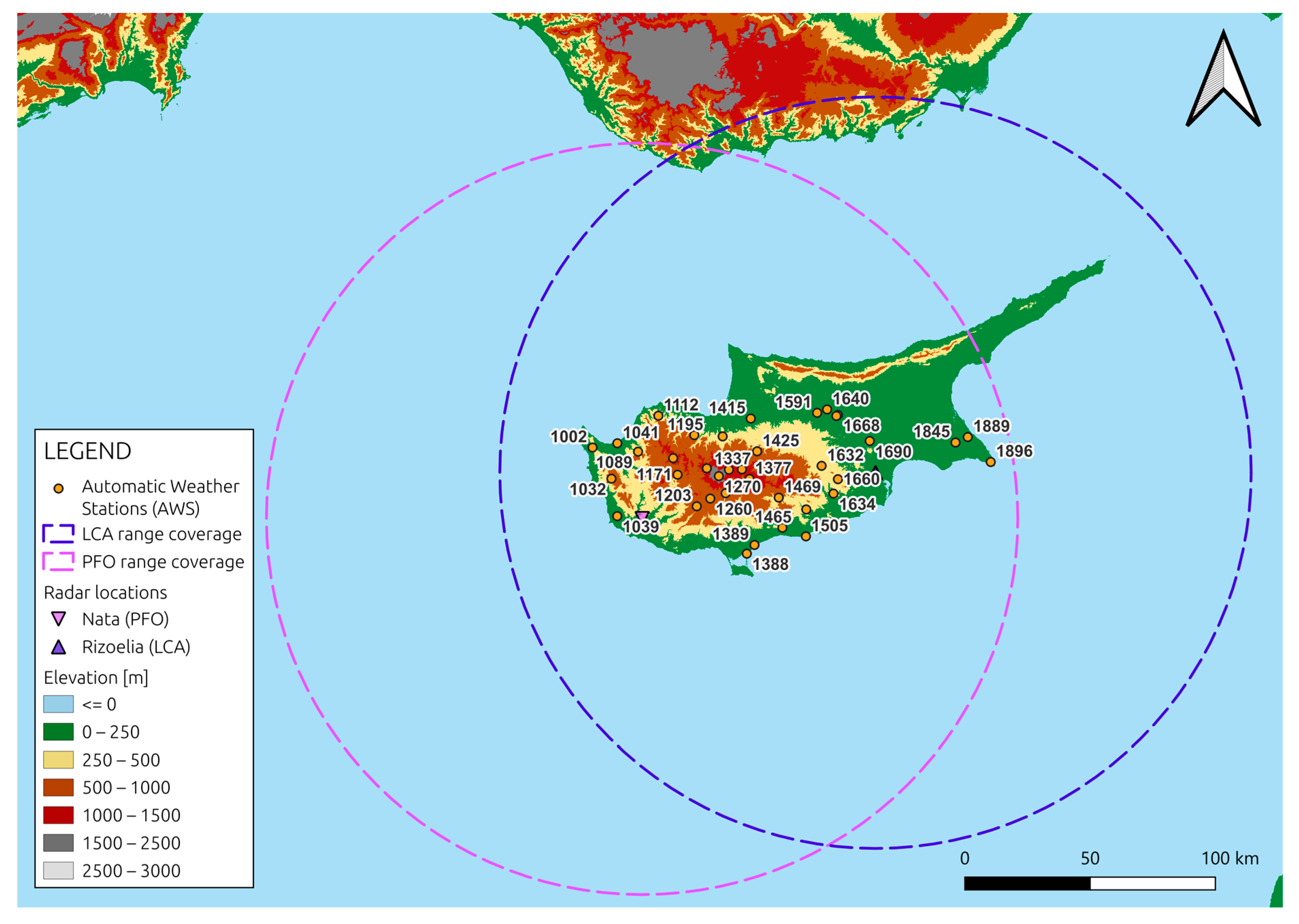 http://www.excelsior2020.eu, accessed on 2 July 2025). The ‘EXCELSIOR’ project has received funding from the European Union’s Horizon 2020 research and innovation programme under Grant Agreement No 857510, from the Government of the Republic of Cyprus through the Directorate General for the European Programmes, Coordination and Development and the Cyprus University of Technology. The authors also acknowledge the Department of Meteorology of the Republic of Cyprus for providing the X-band radar data, as well as the rain gauge data.