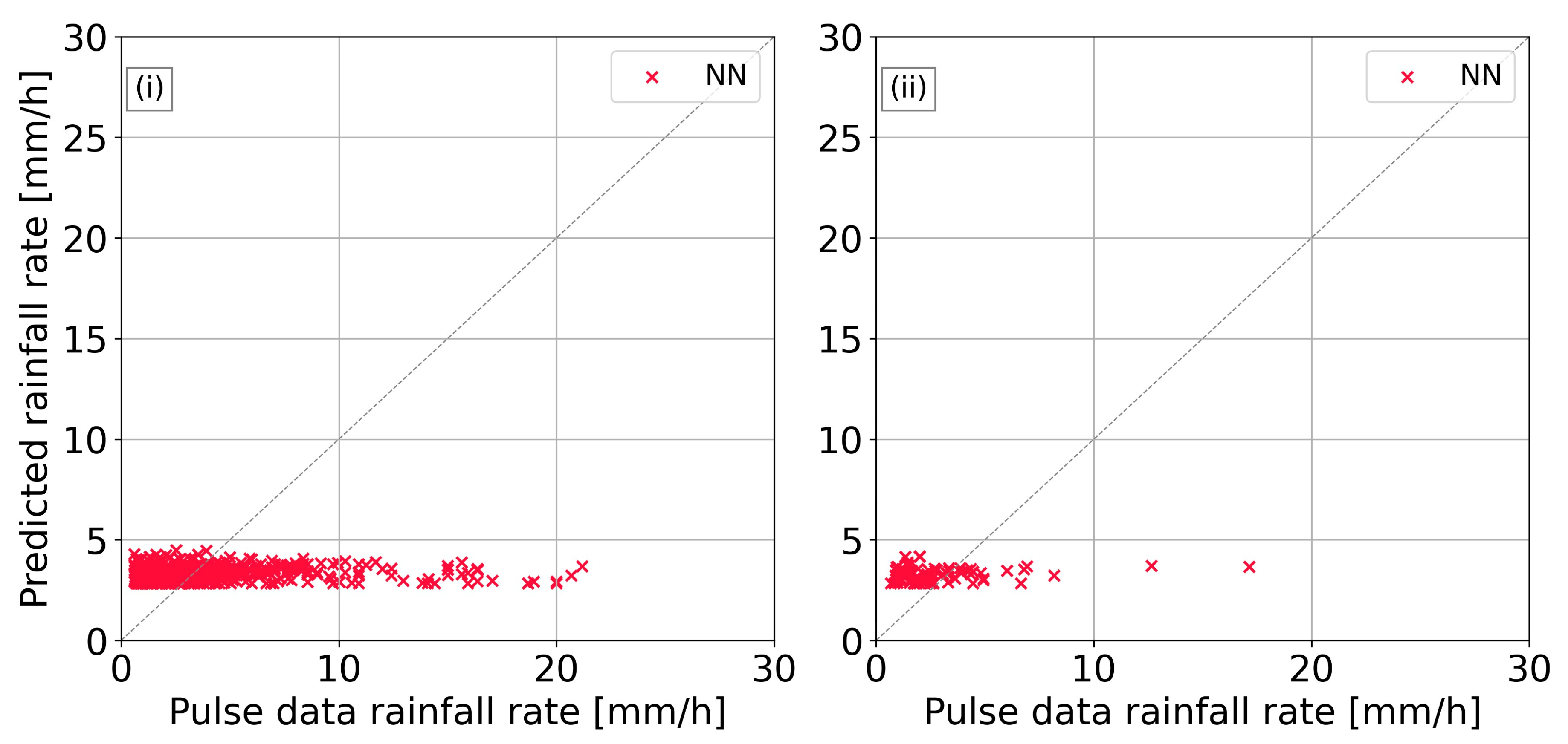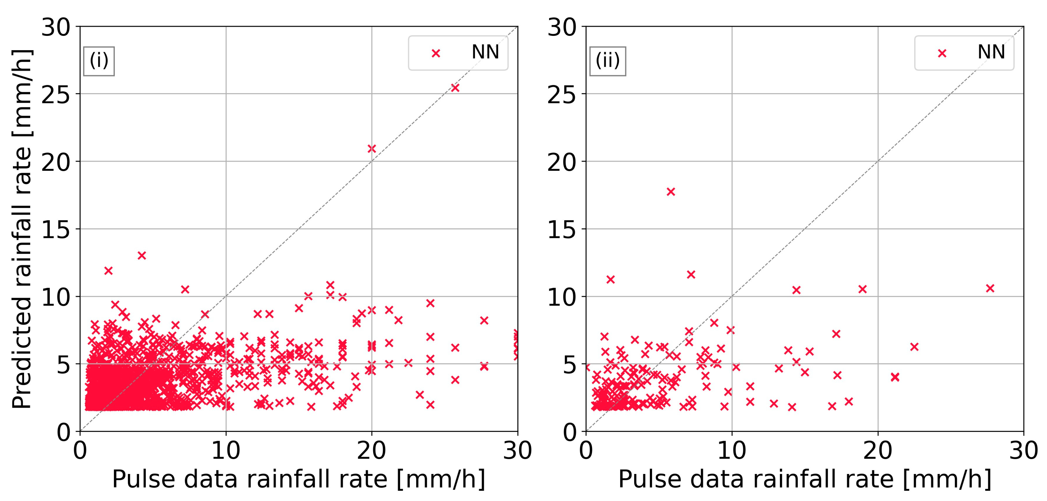Figure 3 illustrate the performance of the neural network models for LCA and PFO radars, respectively. For the LCA radar, the neural network consistently underestimated rainfall rates in both training and test sets, failing to predict values above approximately 5 mm/h, indicating a limitation in capturing higher rainfall intensities. Similarly, for the PFO radar, the neural network also showed a tendency to underestimate, particularly struggling with low-intensity events, as it did not predict rainfall rates below about 1.5 mm/h.