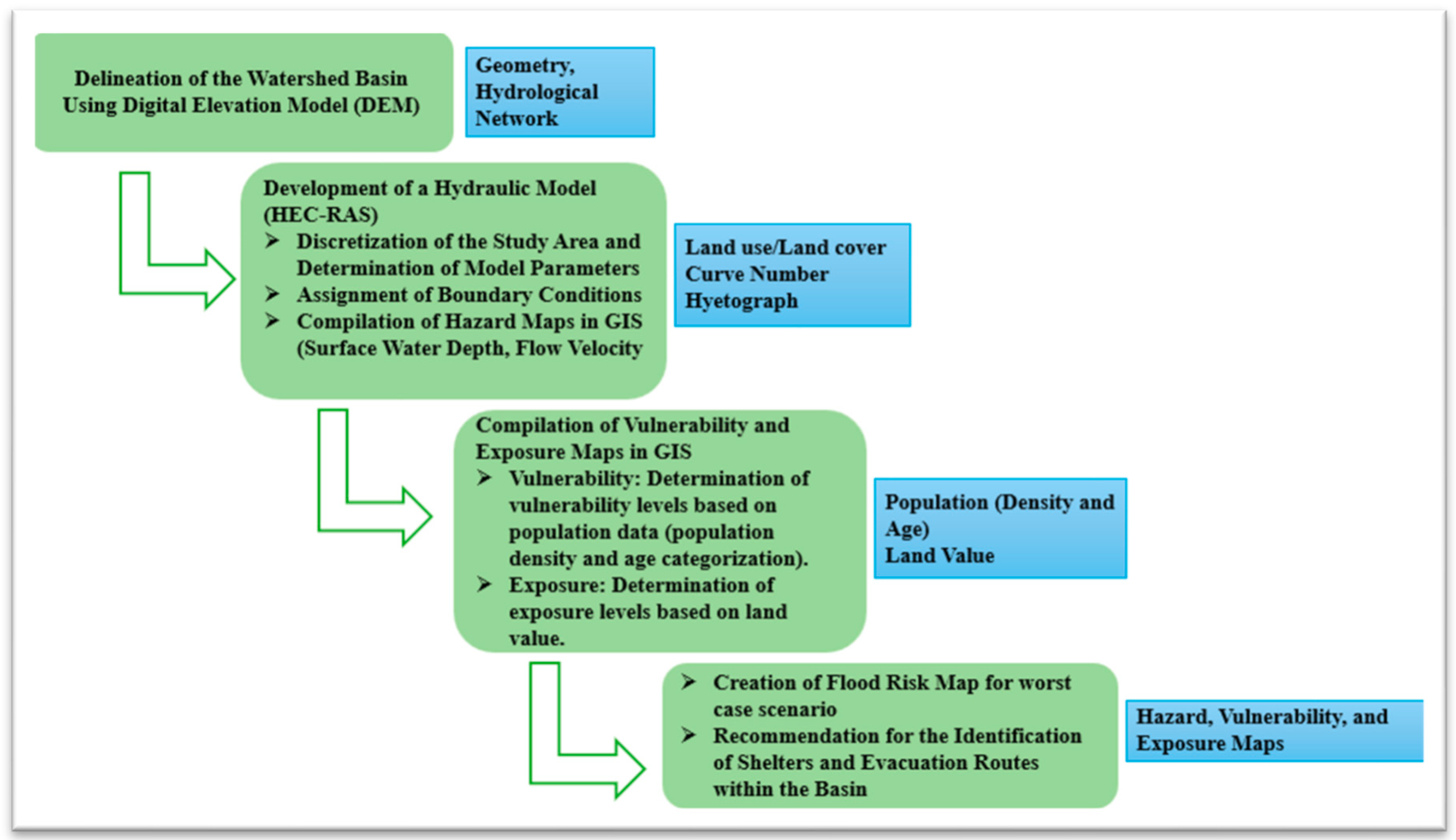This study concentrated on evaluating flood hazards, vulnerabilities, and exposure at a granular level within the Garyllis watershed, integrating both physical and socioeconomic information for a comprehensive flood risk assessment. The suggested methodology seeks to propose mitigation strategies in a scientifically reliable and technologically effective manner. Multiple simulations were conducted using various mesh resolutions to confirm the consistency of hydraulic outcomes. The evaluation of vulnerability and exposure faced inherent limitations due to absent data, which were addressed through a specialized multicriteria approach that integrated photo analysis with logical reasoning. Additional difficulties emerged in the identification of safe zones and escape routes. To overcome these challenges, emergency shelters were chosen from enclosed public facilities that could meet basic needs during an emergency. The location of these shelters was planned in order to guarantee sufficient coverage throughout the river basin. In a similar vein, evacuation routes were chosen from less dangerous locations and designed to avoid the river, reducing the chance of flooding and guaranteeing uninterrupted access in the event of an emergency.