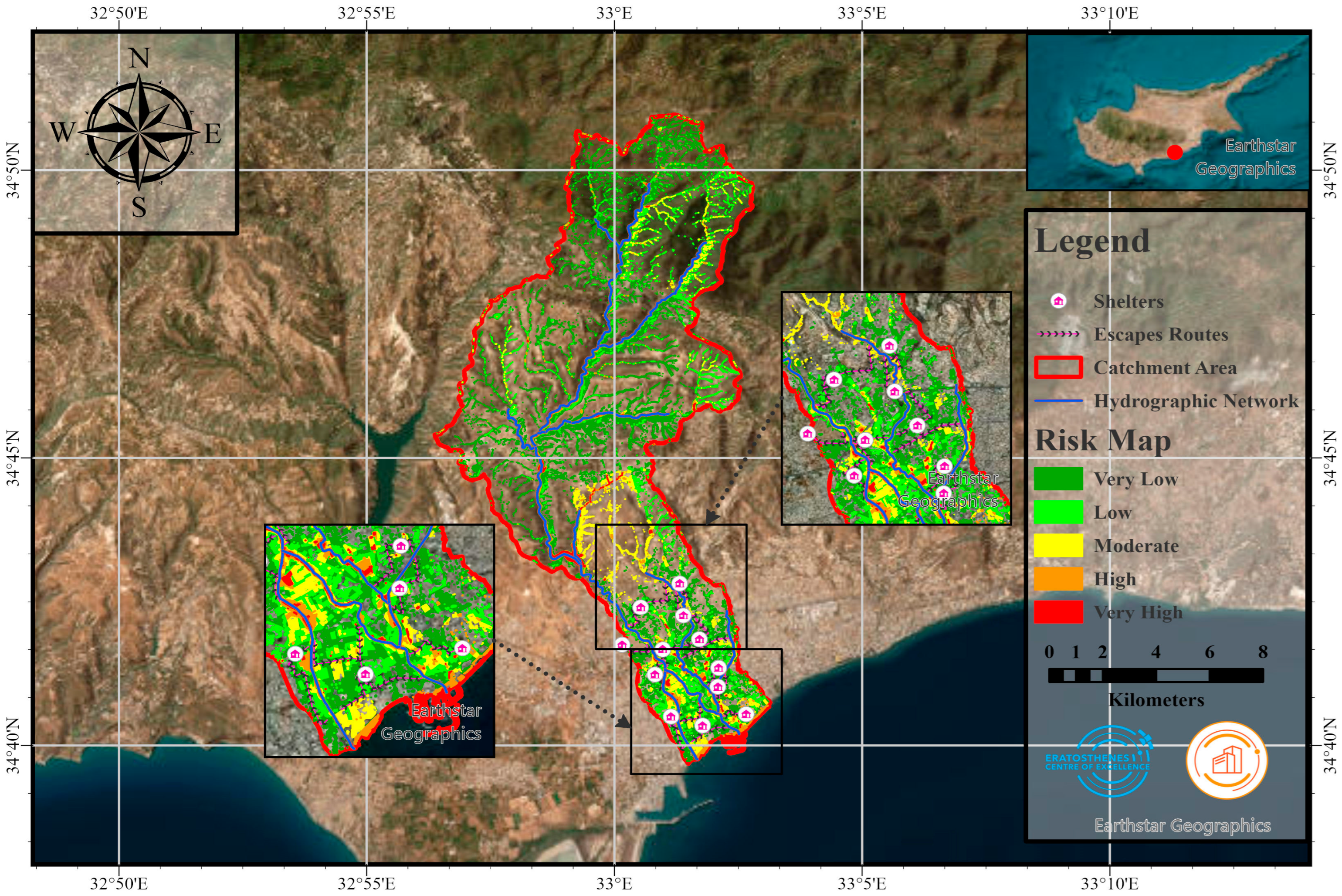 Flooding events have increased in frequency and severity worldwide in recent years, a trend that has been made worse by human activity and climate change. Floods are one of the world’s most dangerous natural catastrophes because of the serious risks they represent to property, human life, and cultural heritage. The necessity for efficient flood management techniques to reduce the growing dangers is what motivated this study. It specifically examines the flood risk in the Garyllis River Basin in Cyprus, a region recognized for it high susceptibility to extreme weather conditions Adopting an integrates approach that combines modeling tools and techniques, such as remote sensing, Geographic Information Systems (GIS) and hydraulic modeling, along with multiple data types of data and in situ measures, this study evaluates flood risk and proposed shelters and escapes routes for the worst-case scenarios. The research utilizes the open-access software HEC-RAS to simulate the spatio-temporal progression of surface water depth and water velocity for different return periods. The vulnerability levels are enumerated through a weighted linear combination of relevant factors, in specific population density and age distribution, according to the last official government reports. Exposure levels were calculated in terms of land value. For each flood component, all factors are assigned equal weighting coefficients. Subsequently, flood risk levels are assessed for each location as the product of hazard, vulnerability, and exposure levels. The validity of the proposed methodology is assessed by comparing the critical points identified during in situ visits with the flood risk level estimates. As a result, escape routes and refuge areas were proposed for the worst-case scenario.