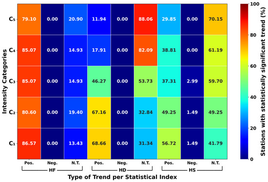 The analysis of the statistically significant trends across all stations demonstrates a predominance of positive over negative trends for all climatological indices, as shown in Figure 2 and confirmed by the MK trend test. Specifically for the HF index, 79.10% of stations for C5 and over 80% stations for the other ICs exhibited positive trends while no negative trends were found. Similarly, the HD index shows positive trends for 68.66%, 67.16%, 46.27%, 17.91%, and 11.94% of stations from C1 to C5, respectively, and no negative trends overall. The HS index presents a similar pattern, with a decreasing rate of positive trends from 56.72% for C1 to 29.85% for C5. However, a small percentage of stations—1.49% for C1, 1.49% for C2, and 2.99% for C3—present negative trends.