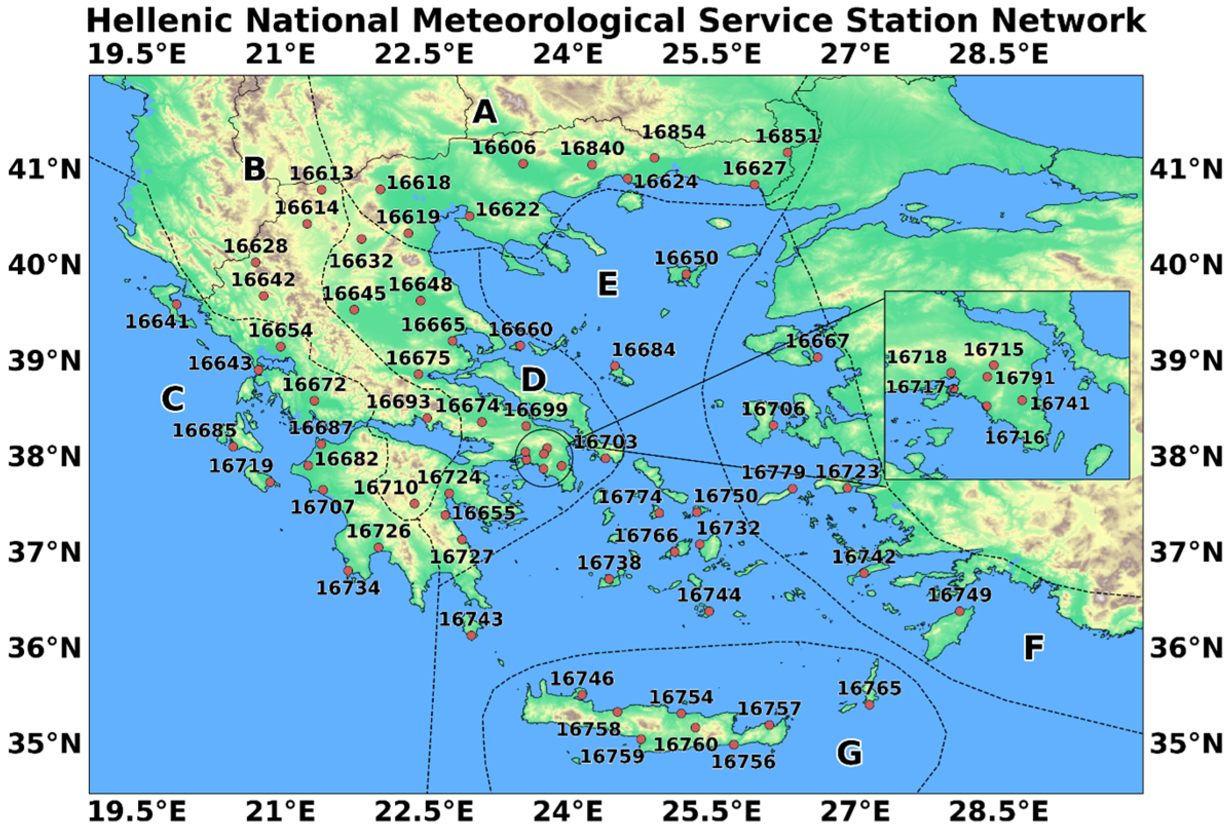 Figure 1, include (A) northern Greece, (B) western Macedonia, Epirus, western Central Greece, Peloponnese, (C) western Greece, (D) mainland-central Greece, the (E) north and central Aegean, the (F) east Aegean and Dodecanese, and (G) Crete and the southern Aegean.
