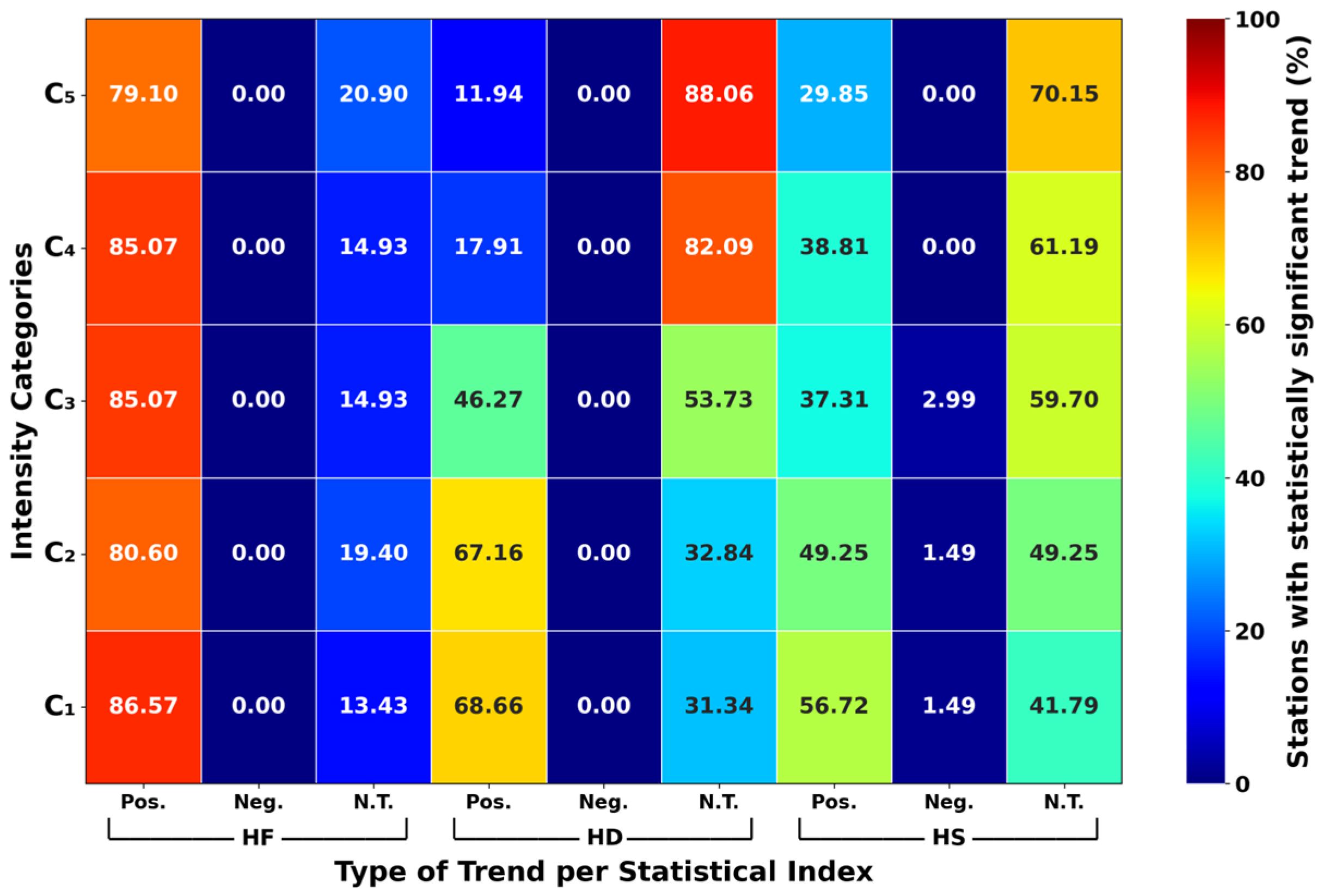 Figure 2 and confirmed by the MK trend test. Specifically for the HF index, 79.10% of stations for C5 and over 80% stations for the other ICs exhibited positive trends while no negative trends were found. Similarly, the HD index shows positive trends for 68.66%, 67.16%, 46.27%, 17.91%, and 11.94% of stations from C1 to C5, respectively, and no negative trends overall. The HS index presents a similar pattern, with a decreasing rate of positive trends from 56.72% for C1 to 29.85% for C5. However, a small percentage of stations—1.49% for C1, 1.49% for C2, and 2.99% for C3—present negative trends.