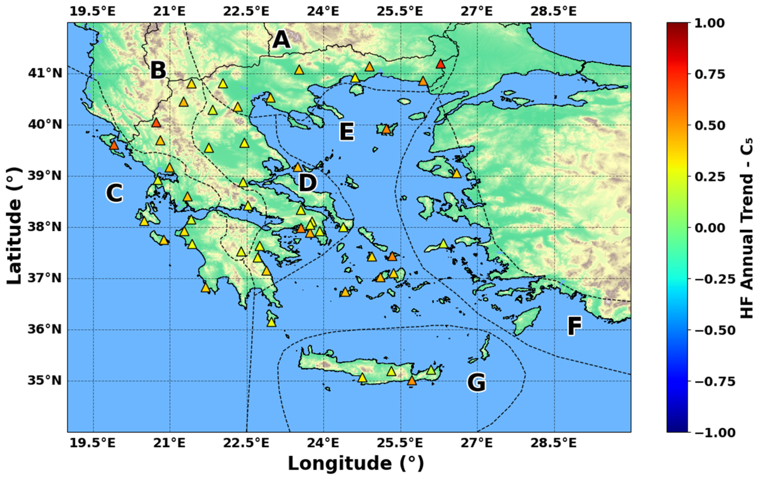 Examining the annual changes in HD, the categories C1 to C3 show widespread statistically significant positive trends, except for a single station in region F for C2. However, the more intense categories, C4 and C5, exhibit positive trends are primarily located in region C. Seasonally, fewer than 10 stations show statistically significant trends in winter, with most ranging from 0.0 to 0.2 days per year. In spring, positive HD trends for C1–C4 mostly present positive trends in regions D and G, while C5 is mainly in regions C and A. In summer, positive trends are widespread for C1–C3, but more localized for C4 (region C and northern region B) and the most intense ICs. During autumn, the lower ICs show widespread positive trends across Greece, while C4 and C5 have more localized positive trends in region C and northern region B.